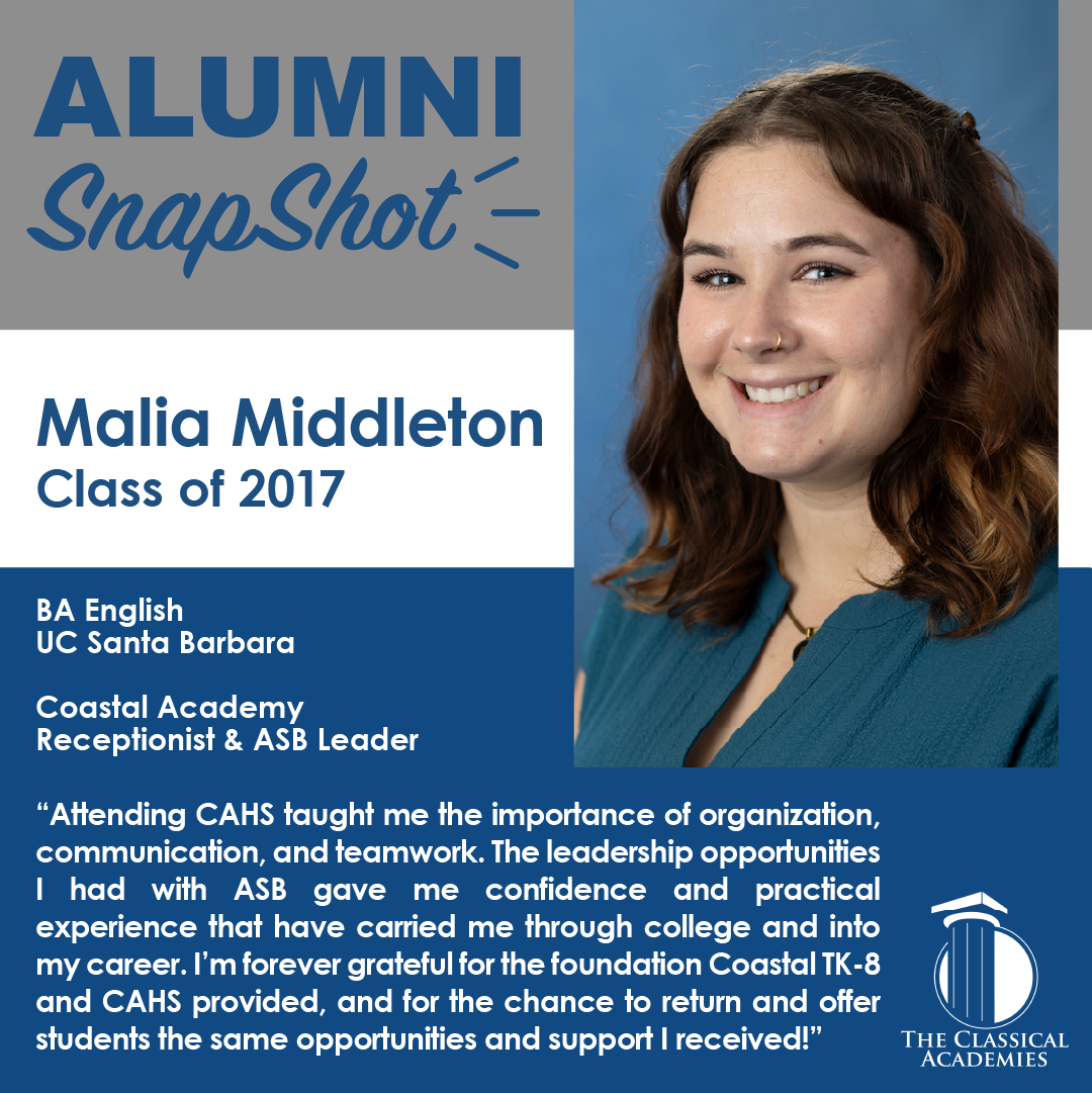 The Classical Academies is proud of the graduates who continue to live out the values of leadership, character, and service. We invite alumni to share their journeys by completing an Alumni Snapshot, a short feature highlighting their experiences and accomplishments since graduation. Your story helps us honor our shared history, inspire the next generation of students, and strengthen our community!