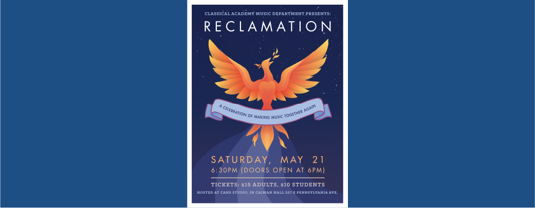 The Classical Academies' Music Department presents Reclamation, a Celebration of Making Music Together Again, on Saturday, May 21, 2022, at 6:30 pm. Doors open at 6:00 pm. There will be a live band, drumline, and musical performances from grades 6-12. The concert will be held at Classical Academy High School Studio Campus, located at 207 E Pennsylvania Ave in Escondido. Tickets are $15 for adults and $10 for students and can be purchased at the door.